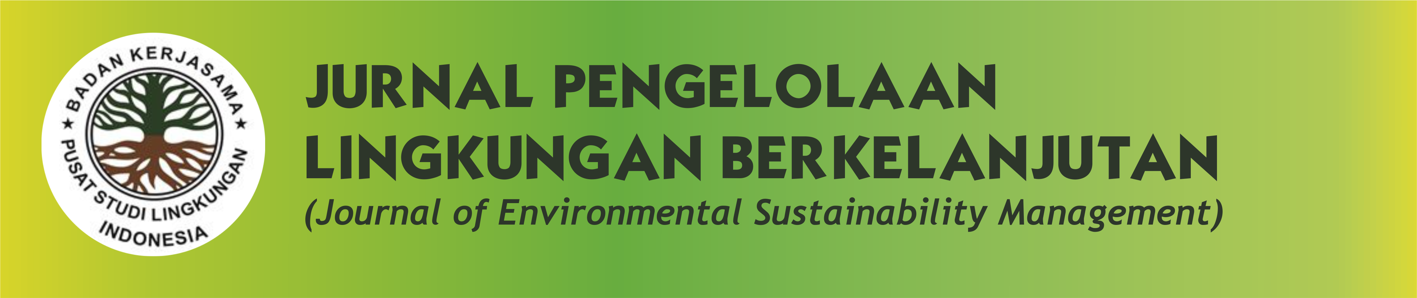 Jurnal Pengelolaan Lingkungan Berkelanjutan (Journal of Environmental Sustainability Management) (abbreviated as JPLB) is an open-access journal which is the result of a collaboration between the Indonesian Environmental Study Center Cooperation Agency (BKPSL) with the Environmental Research Center - Institute for Research and Community Service, IPB University (ERC-IPB). JPLB has jointly managed since 2017, with a period of publication are 3 (three) issue numbers per year (5 articles per issue number).